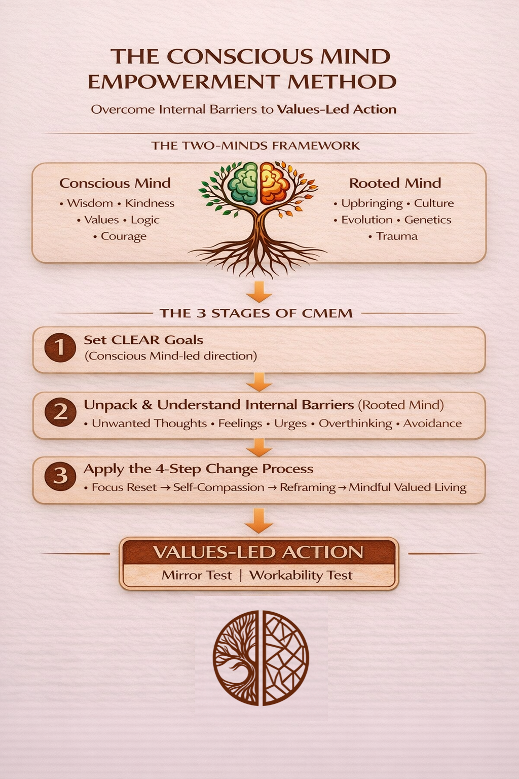 The Conscious Mind Empowerment Method is applied through a clear three-stage structure designed to translate insight into action.